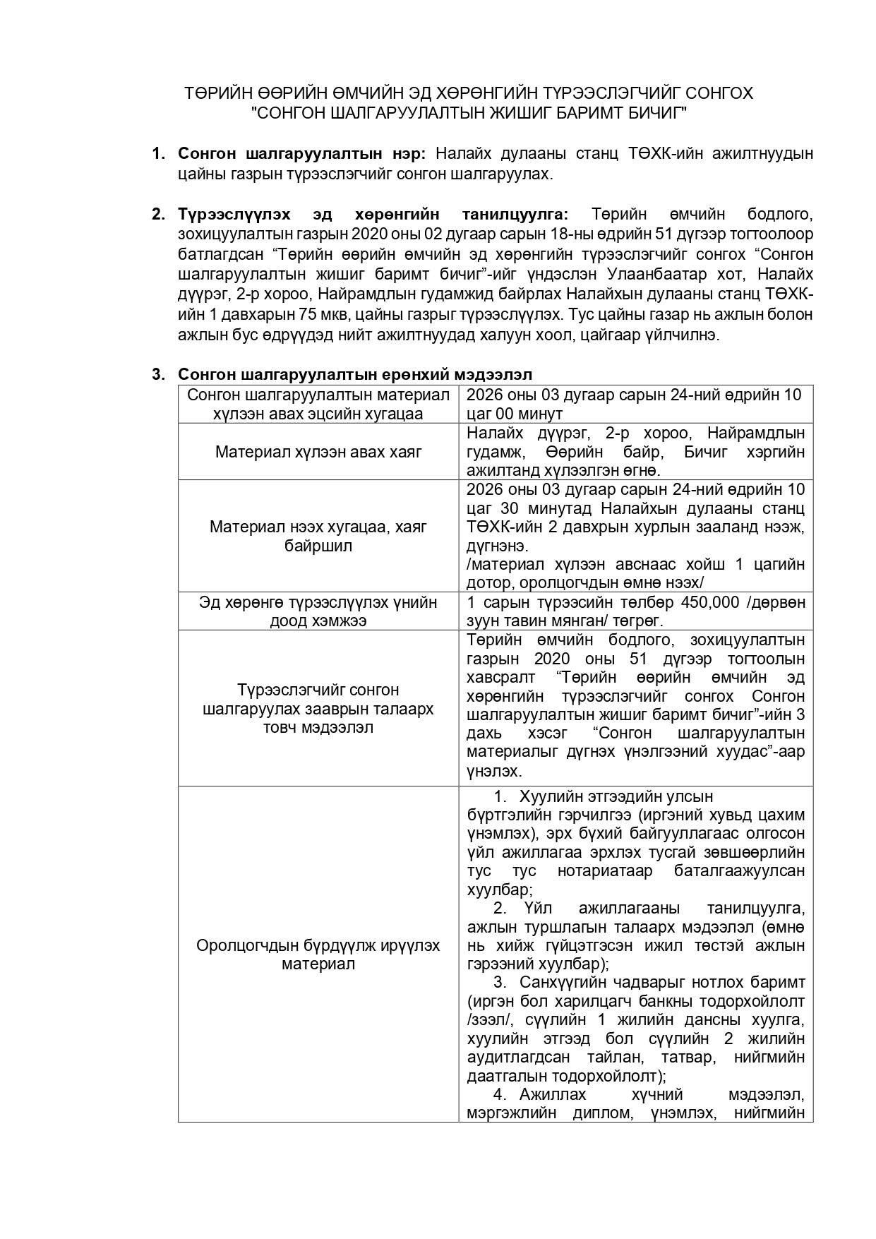 Цайны газрын түрээслэгчийг сонгон шалгаруулах зар