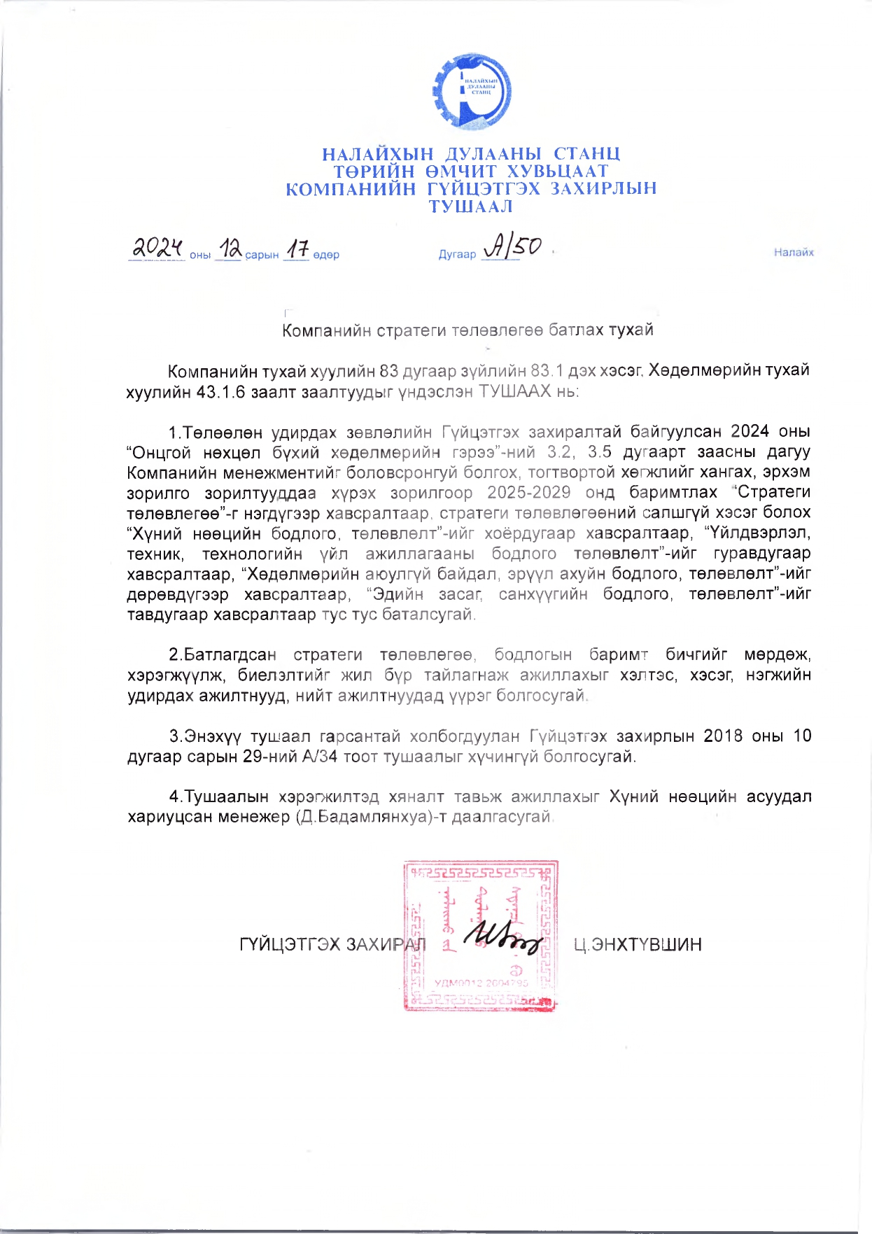 "Налайхын Дулааны станц" ТӨХК ТУЗ-ын дарга, гишүүд